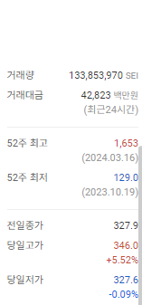 최근 가장 저점으로 327원까지 폭락하는 모습도 보여주었습니다.