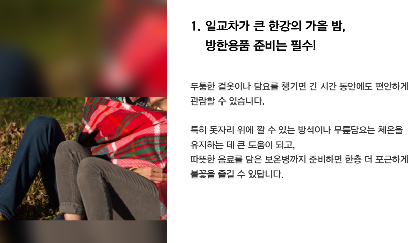 - 여의도 한강공원 : 메인 장소, 불꽃과 가까움